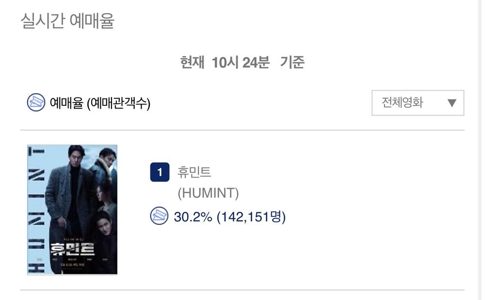 개봉을 3일 앞둔 ‘휴민트’가 ‘왕과 사는 남자’를 꺾고 예매율 1위를 차지했다. 현 시각(오전 11시 35분 기준), ‘휴민트’는 실시간 예매율 31.3%를 기록하며 ‘왕과 사는 남자'(29.1%)와의 격차를 더 벌렸다. 첫 시사회 이후 실관람객들의 뜨거운 반응이 가파른 예매 상승세로 이어진 ‘휴민트’는 사전 예매량 14만을 돌파하며 흥행에 대한 기대감을 높였다.